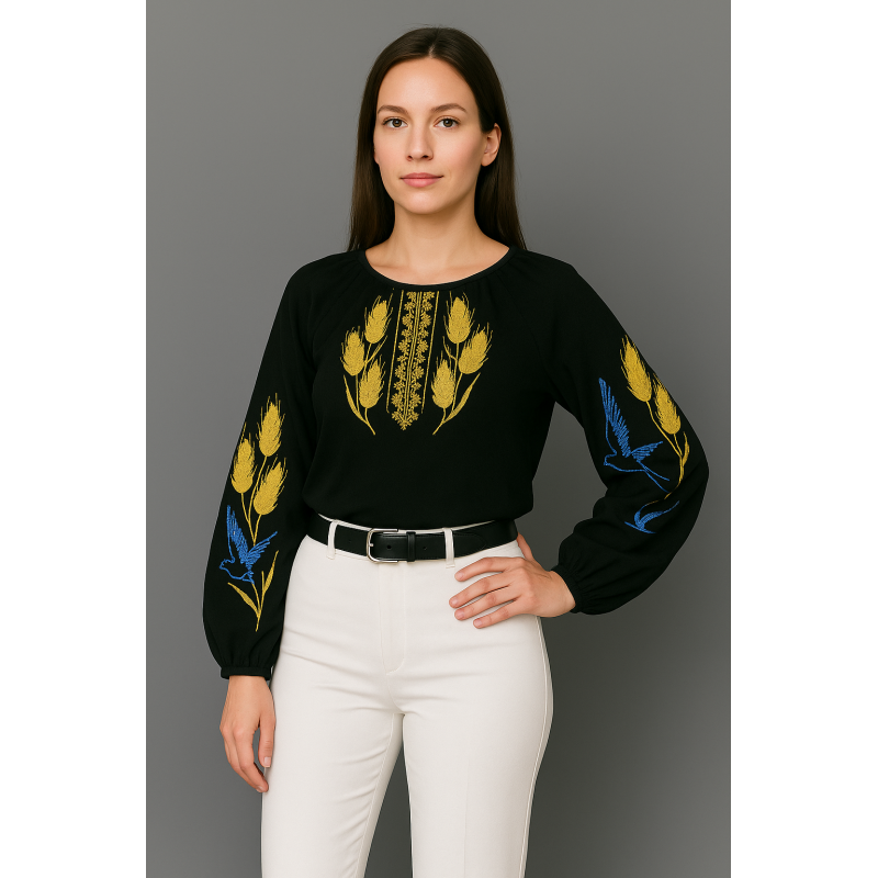 Вишивка з колоссям на грудях символізує достаток, силу та родючість, а орнамент із птахами на рукавах — свободу, мир і любов до рідної землі. Вишивка виконана якісними нитками з чіткою деталізацією та насиченими кольорами.